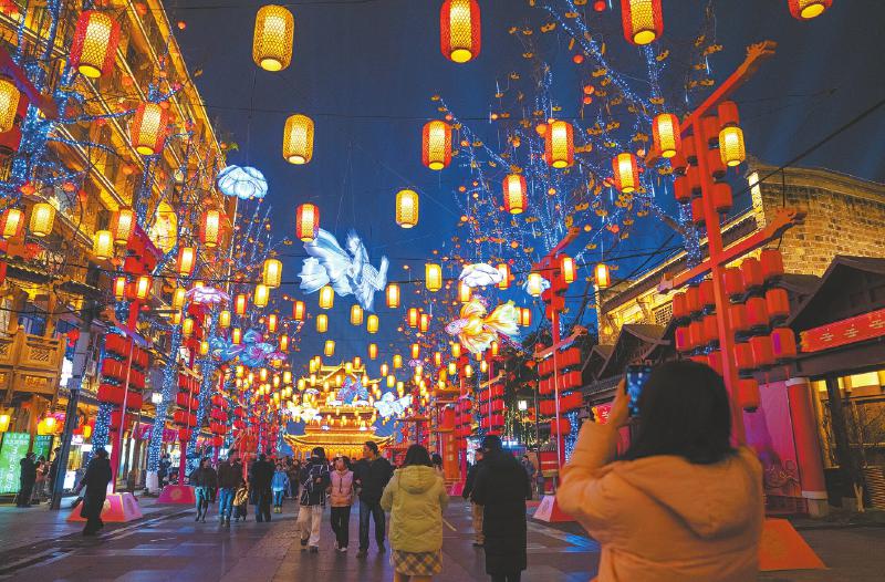 观彩灯 1月23日晚,宜宾翠屏区合江街,游客用手机记录夜景。四川日报全媒体记者 李强 摄