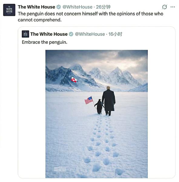 白宫24日在社交媒体平台X上发布一张人工智能合成图片,显示总统特朗普与一只举着美国国旗的企鹅在雪地上漫步。