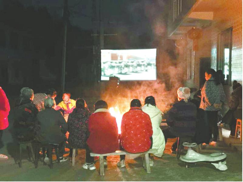洪雅县柳江镇万湖村村民聚在一起看农村公益电影。眉山市委宣传部供图