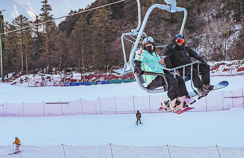 1月23日,游客在汶川县灞州镇阿尔沟羌人谷滑雪。