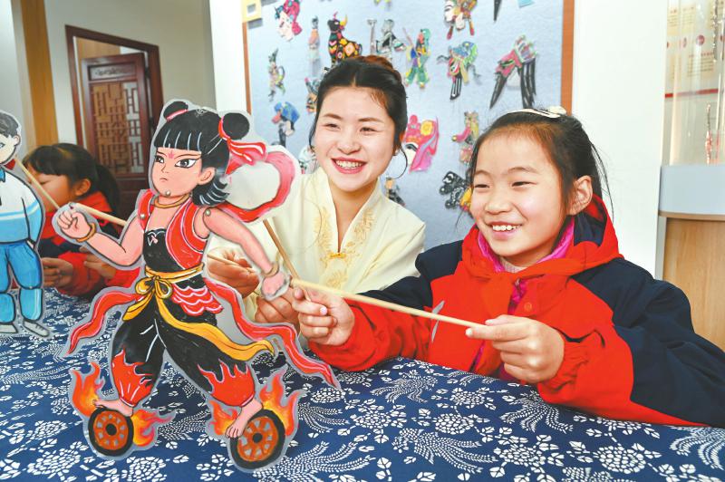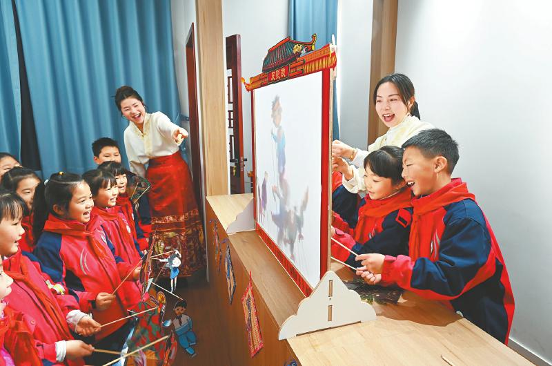 近日,在内江市东兴区外国语小学,老师指导学生表演皮影戏。近年来,该校将落实“双减”政策与非遗传承相结合,组建皮影戏社团,每周定期开展皮影制作、皮影戏表演等培训课程,让学生近距离接触皮影戏艺术,感受非遗魅力。 兰自涛 摄(C视觉)