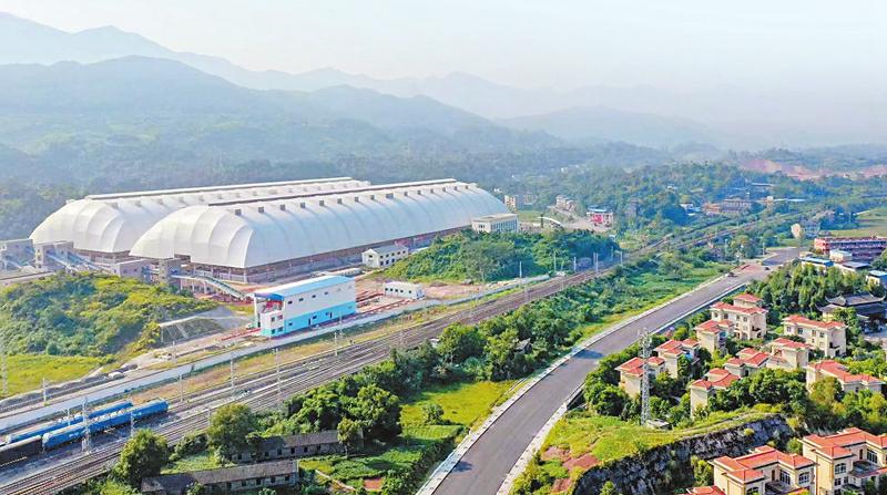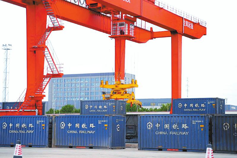 内江国际铁路港内,龙门吊正将到站的货物集中装卸。唐广 摄