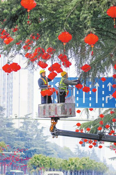 2月2日,眉山市东坡区街道上,工人在道路两旁的树木上悬挂红灯笼,为城市营造出浓浓的年味。 李继军 摄(C视觉)