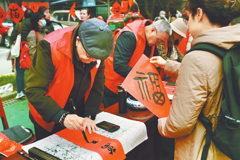 银龄志愿者在学校的迎新年送祝福活动中写“福”字送祝福。