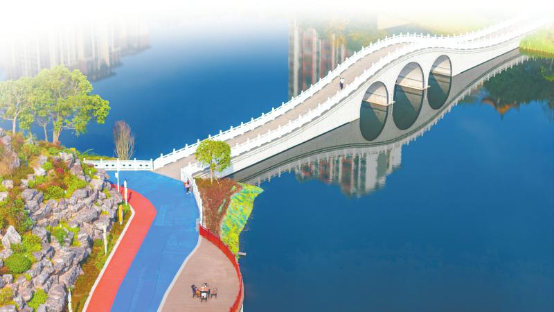 广安市广安区北辰湖公园,清澈的湖水倒映着蓝天白云和亭台楼阁。张波 摄(C视觉)
