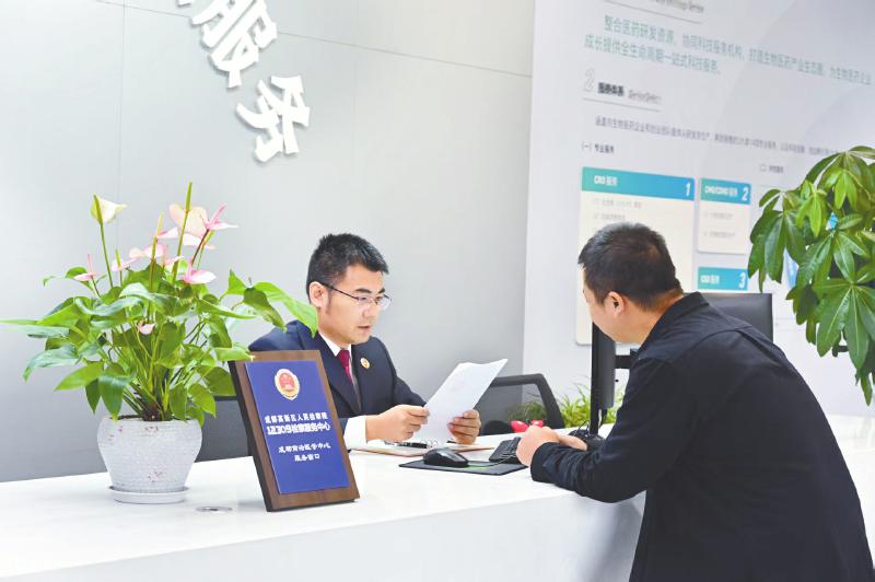 检察官在服务窗口接收企业提交的服务需求材料。