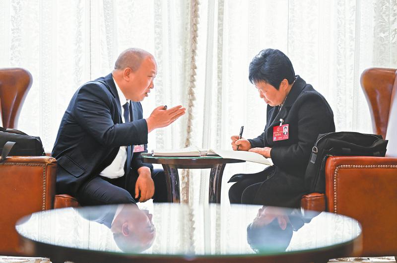2月2日,省人大代表赵小建(左)与黄文珍利用午休时间“对账”。他们计划共同草拟一份关于完善农村合作医疗保险的建议,降低老百姓的缴费压力、提升参保率。四川日报全媒体记者 杨树 摄