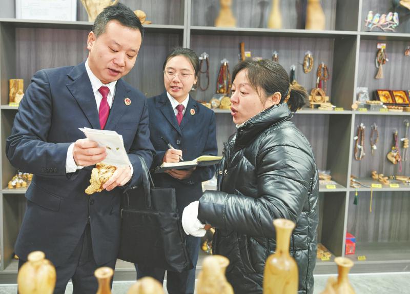 2025年11月,剑阁县人民检察院检察官在翠云廊实地了解文创产品使用地方特色商标情况。