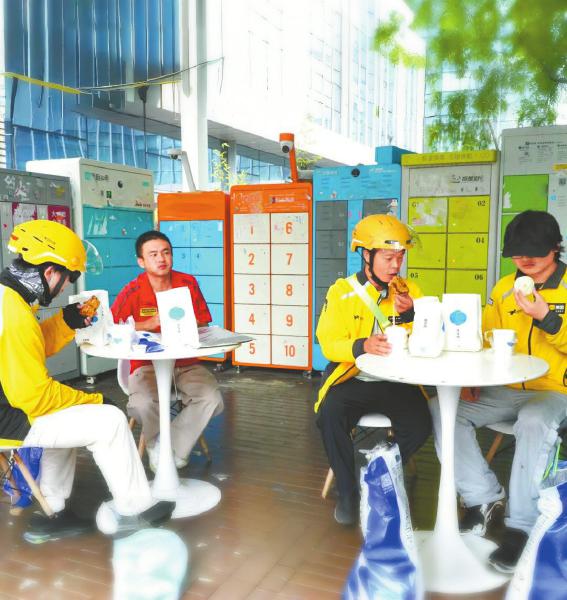 2025年9月,外卖骑手在驿站吃暖“新”免费早餐。 四川省职工发展基金会供图