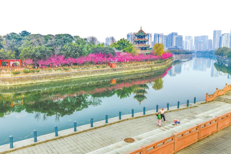 2月3日,成都望江楼旁,红梅花开,水清岸绿,尽显蓉城生态之美。 林漫 摄(C视觉)