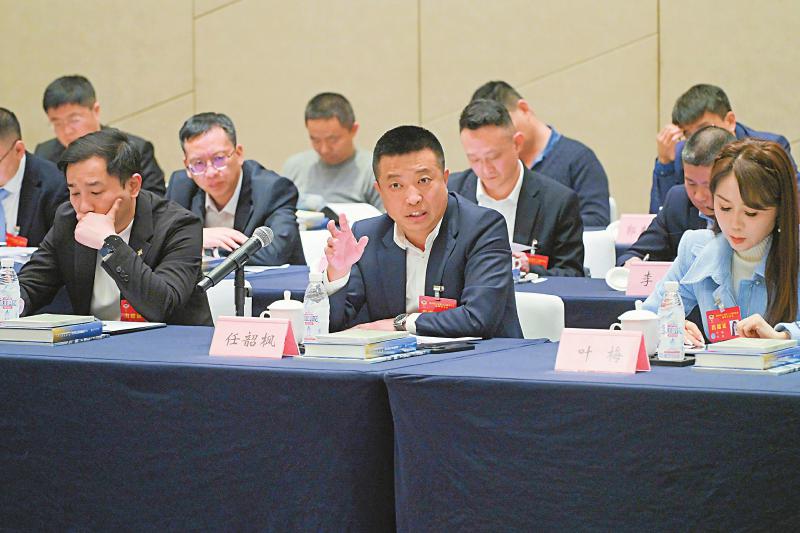 任韶枫委员(前排右)建议,企业应以推动高质量转型为导向,强化研发能力、完善研发体系,并加强与高校及科研院所协同合作,提升成果筛选评估能力,促进科技成果精准转化。