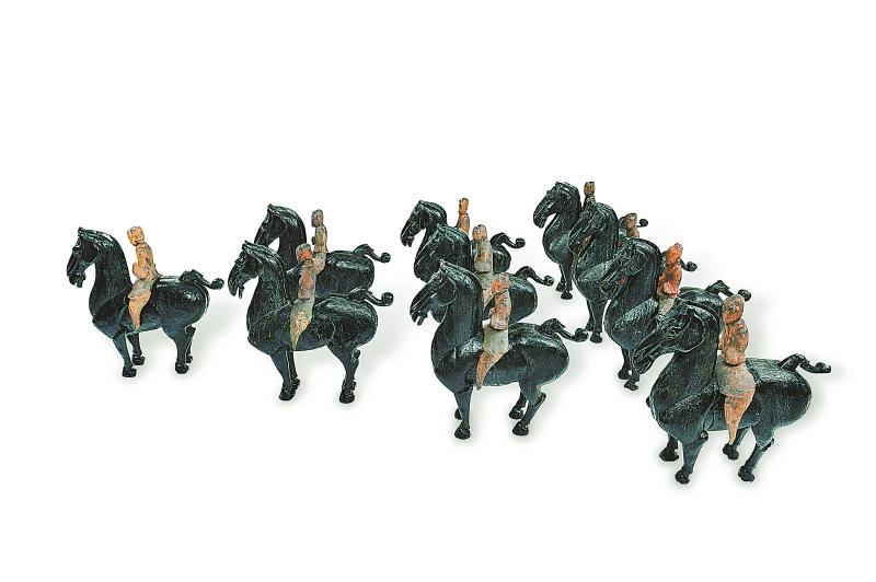 绵阳市博物馆汉代木胎漆马与骑马木俑。