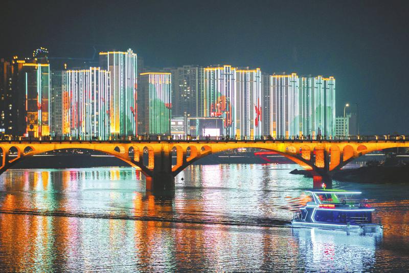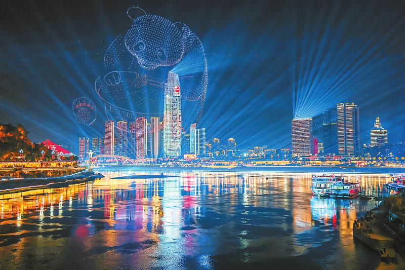 2月11日夜,宜宾市三江口上演“长江首城·骐骥驰骋”无人机灯光秀,以科技光影迎接新春。5000架无人机以天为幕,璀璨盛景点亮长江首城夜空。 张元戎 摄(C视觉)