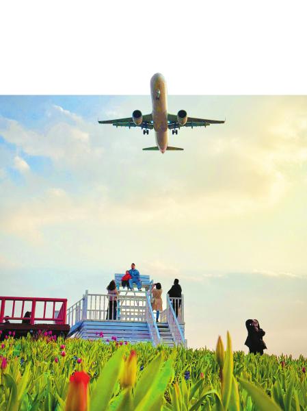 二月十一日,成都市双流区空港花田,新春主题装置亮眼,市民游客争相打卡。图为游客在观景台与头顶飞过的飞机合影。龚榜玉摄(C视觉)