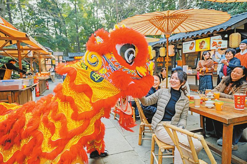 2月13日,“大雅中国年·人日游草堂”成都杜甫草堂博物馆春节系列文化活动正式启幕。这是舞狮与游客欢乐互动。周巧旻 摄(C视觉)