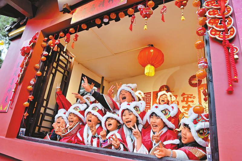 2月17日,武侯祠成都大庙会上,一群活泼可爱的小喜神向游客拜年,祝福马年吉祥如意。彭银高 摄(C视觉)