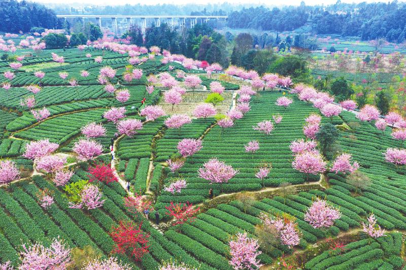 2月23日,雅安市名山区新店镇茶园内樱花盛放,吸引游客前往打卡。 张惠玲 摄(C视觉)