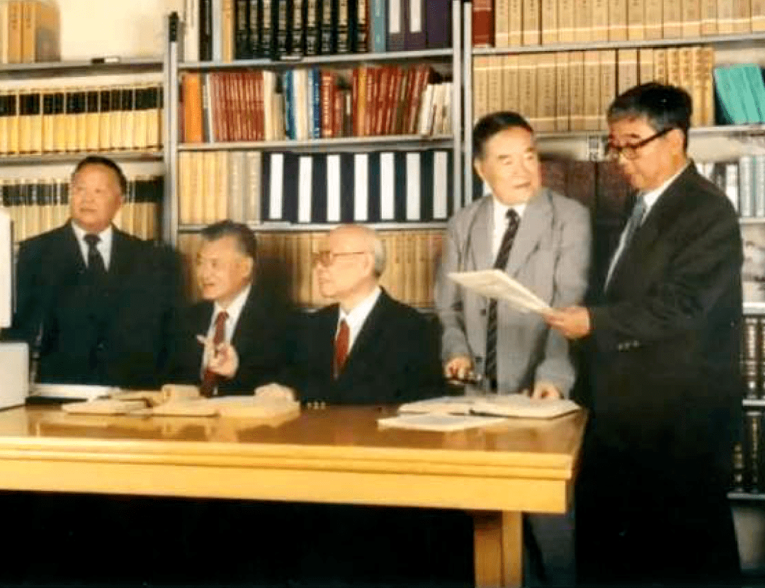 宋蜀华先生(左二)与老师林耀华先生(中)及同事交流教研心得(右一为王辅仁教授,右二为陈永龄教授,左一为邵献书教授)