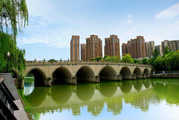 九眼桥的河水水面平静如镜,清澈见底,站立旁边,你会静静地陶醉在那份神怡的美妙中,那一刻,真正领略什么叫心如止水。微风拂过,波光粼粼,泛起丝丝清幽的水纹,由远及近,忍不住想闭上眼睛,用心去感受那份水的美。河两边的树不知何时已悄悄倒影于水中,你已找不到水的分界线,只感觉翠的树、青的水已融为一体,浑然天成的一幅美丽的泼墨山水画,在“树阴照水爱晴柔”的意境中逐渐延伸。