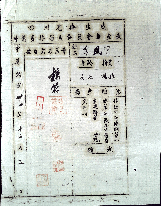 执照上贴有5枚印花税票。该税票是1927年国民政府财政部统一印制的地图旗图印花税票,票面颜色为绿色,上铭“国民政府印花税票”字样,下印“贰分”“2 CENTS”,票面上还加盖“川康”“成华”印章。与经济、金融息息相关的印花税票里蕴藏了悠久的文化,从中可了解到特定历史时期相关税收、税费等情况。据查阅相关资料,印花税票是具有固定面值的有价证券,是国家为收取税金而印刷的纳费凭证,有票幅、图幅、主图、齿孔、年号等,与邮票酷似。印花税是国家对因商事、产权行为所立或使用的凭证征收的税,它采用在凭证上贴印花税票的办法征税。1934年6月,李风宣医士为办开业执照,需要缴纳的印花税为国币5个2分。幸运的是,执照后面还附有“四川省中医资格审查委员会审查表”,注明姓名为李风宣,李风宣的籍贯是阳县,年龄67岁,审查结果是“核符”,具体审查内容是:“核与中医条例第一条第二款及中医审查规则规定相符”,然后审查委员会李才俊等委员署名盖章,并钤“已入卡”印,审查时间是1942年12月2日。通过“四川省中医资格审查委员会审查表”可以说明,民国时期医生开业获得执照后,还得定期进行审查,严格进行监管,以规范医士的执业行为。