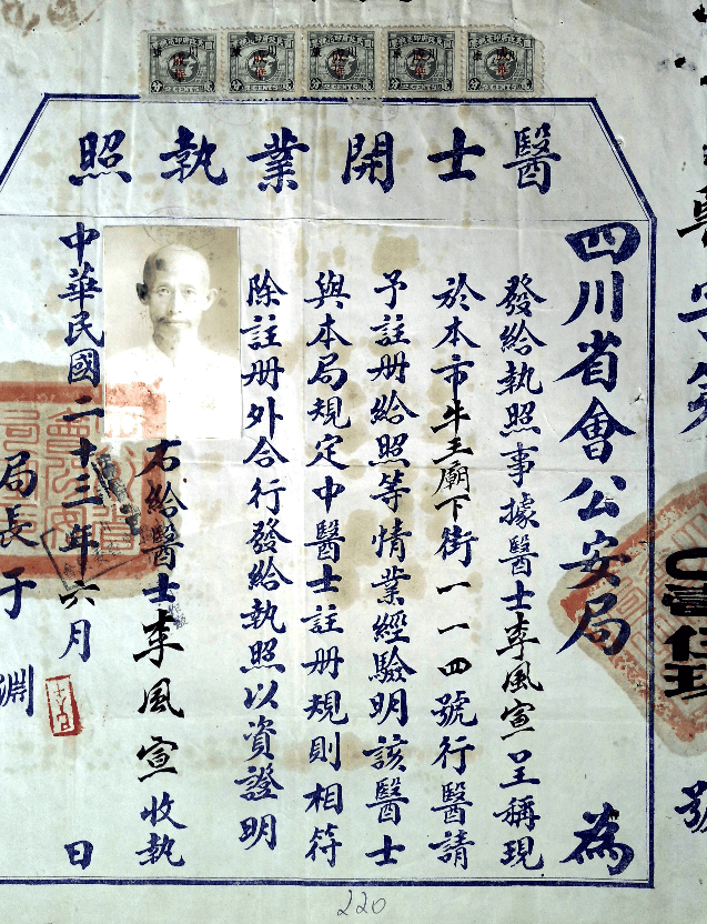 该执照尺寸大小为25厘米×30厘米,系1934年6月四川省会公安局颁发,执照内容写道:“四川省会公安局为发给执照事,据医士李风宣称,现于本市牛王庙下街114号行医,请予注册、给照等情。业经验明,该医士与本局规定中医士注册规则相符,除注册外,合行发给执照,以资证明”。从执照内容看,民国时期医士开业有严格的注册、审核规则,必须仿照当时相关条例执行。执照上还注明“右给医士李风宣收执”,说明这份执照应是民国时期主管部门留存档案用,不知何故、何时流向市场,估计因战争等因素,档案管理不善而流向市场,后为藏家获得,多种原因又再次流向市场。执照上还贴有李风宣医士单人照片,落款为“局长 于渊”。据查,于渊于1926年加入中国共产党,1933年刘湘统一四川后被任命为四川省公安局局长。1938年刘湘病逝后,于渊弃职回川从事统战工作,并于1942年加入中国民主政团同盟(后改为民主同盟),1947年6月2日被捕,1949年12月7日深夜被杀害于成都十二桥。执照上钤“四川省会公安局印”“已入卡”等印章,右侧加盖“四川省公安局印”骑缝章。