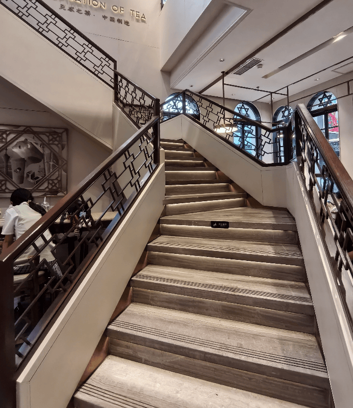 北门前坝子里的喷水台、窗棂上的六角星、二楼阳台的罗马圆柱栏杆,都散发出西式风格。门外的屋檐各有两根中式青砖方柱支撑,砖柱上方是中式雕花十分斑驳,半脱落的青苔里透着沧桑。南北大门原本没有主次,为迎合游客,“喜茶”商家把窄巷子的北门做了主门,井巷子的南门做了副门。室内的旋转楼梯占了较大面积,楼上楼下东面的屋子均没有开放,小洋楼更小了,每层楼仅能摆放五六张小茶桌,在小洋楼喝茶便珍贵起来。