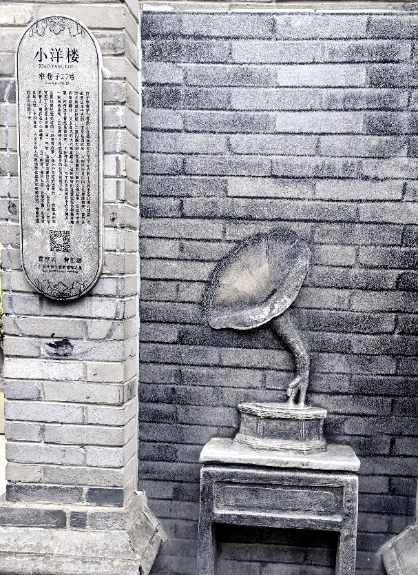 牌坊造型独特,中间开了道门,上楣有雕花,左下面雕刻有一台喇叭花留声机,那音乐是从这里传出的。牌坊右边整幅雕刻的是一对西洋男女,女子穿着西洋裙坐着,端庄优雅,男人西装革履站在她身后。据说他们是一对夫妇,当27号被法国人开作西医诊所时,他们在这里工作过。