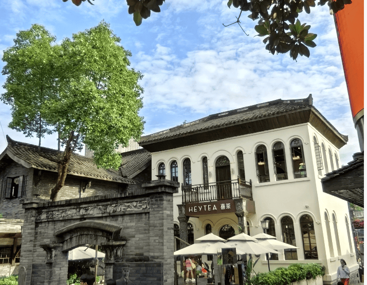 小洋楼是21世纪初修缮的。共两层,中西合璧,南北通透,楼体占地面积不足一百平米,这便是“小洋楼”的由来吧!它在一众青黛砖瓦的四合院落中与众不同,西侧开辟了一条小道,将窄巷子与井巷子相连,打破了一条“胡同”到底的格局。它在宽窄巷子整个旅游景点的位置居于“C位”,加上楼前楼后比较空旷,旅客从狭窄的巷子逦行于此,便豁然开朗。
