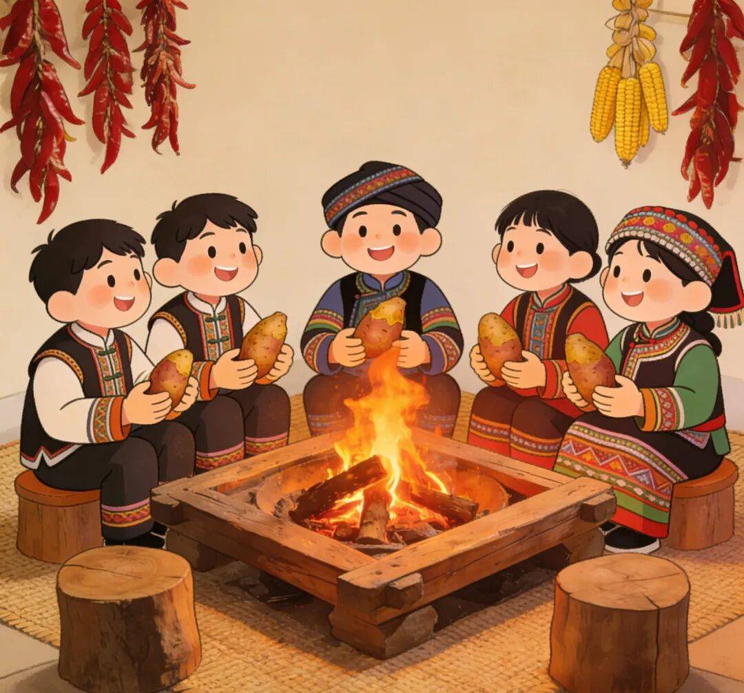 然而对于小孩子来说,用火笼取暖远不是主要目的,更多令人愉快的事情都在取暖之外——火笼已然成了孩子们的“美味制造机”。当火烧旺后,火笼里的灰也被烧得很烫,烧过的木柴变成炭火,炭火又化作滚烫的灰烬,我们称之为堂夹灰。往这热灰里放几个土豆,很容易就烧熟了,而且不会糊。当烧土豆被刨出来的一瞬间,满屋都飘着烤土豆的香味,甚至顺着墙壁的缝隙飘到隔壁。冰凉的手拿起滚烫的烤土豆,不停地左右交换拍打,一边“呼呼”吹气降温,一边将拍破的土豆皮撕扯下来,露出微黄微脆的土豆,咬一口,整个人立即被幸福感包围。其实从土豆离开火笼到吃进嘴里,短短几分钟口水已经吞咽了好多次。每次吃烧土豆,都是对味蕾的极大诱惑。