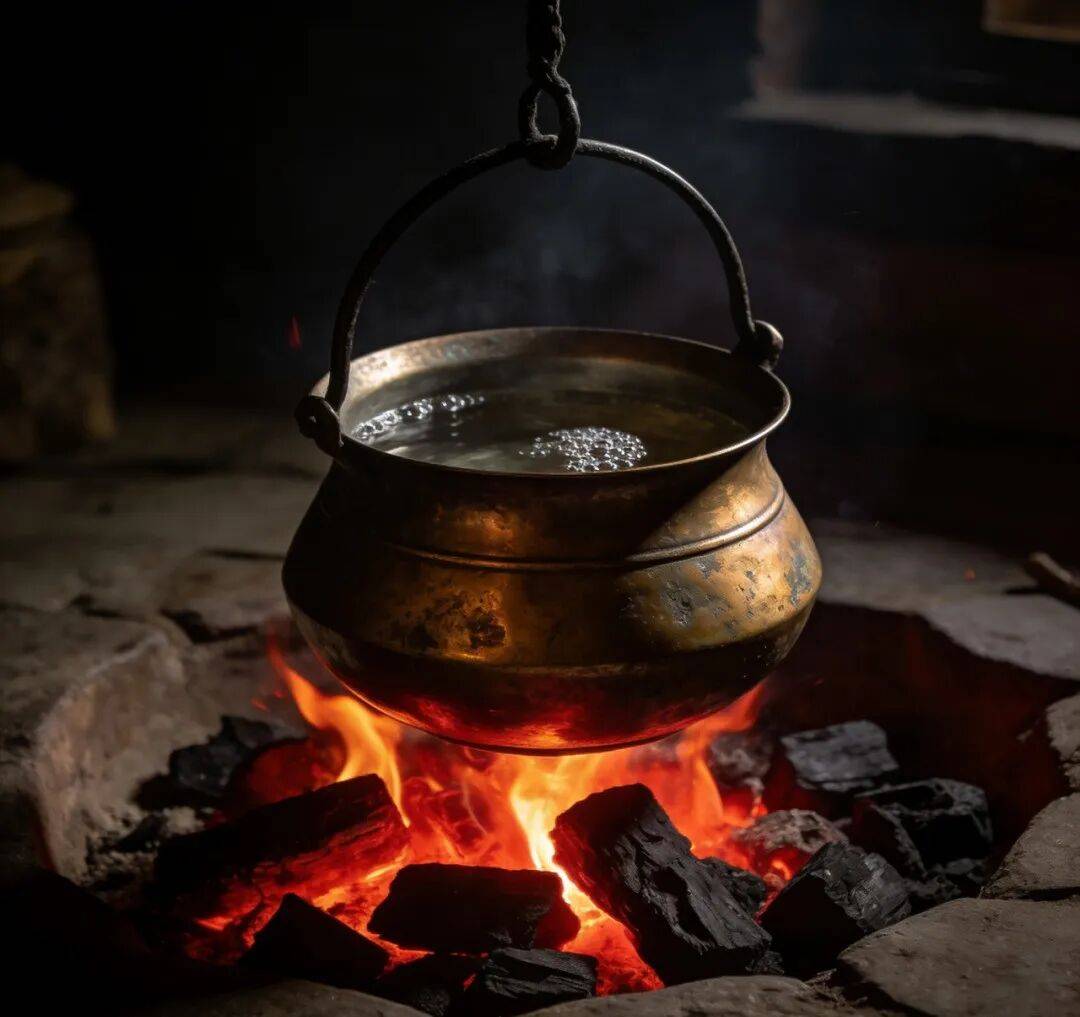 火笼的上方,从房梁垂下一根结实的粗铁丝,近火笼的下端连接一段铁链或者几段铁丝相互环扣的链,以便收放。铁链末端固定一个木钩或铁钩,钩上挂一个铁鼎锅(一种圆形铁锅,形状如同水壶,但没有水嘴)。只要火笼生了火,家里便不会缺热水,寒冷的冬天,洗脸泡脚、洗菜洗衣都很方便。