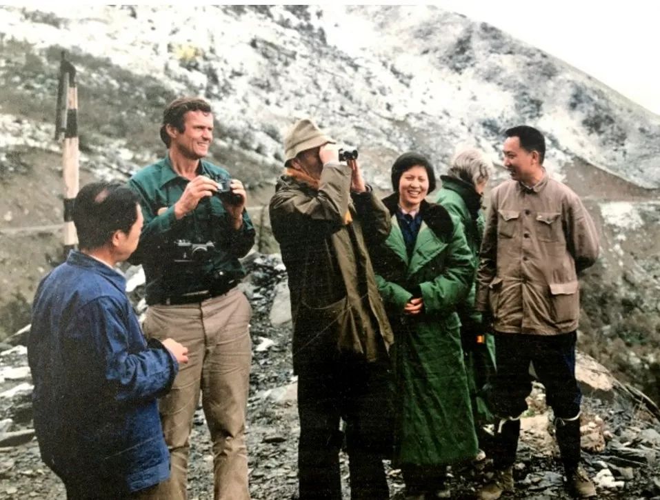 1981年,胡锦矗(右一)与世界自然基金会著名动物学家乔治·夏勒(左二)在海拔4000米的卧龙贝母坪考察野生大熊猫(图片来源:教育导报)