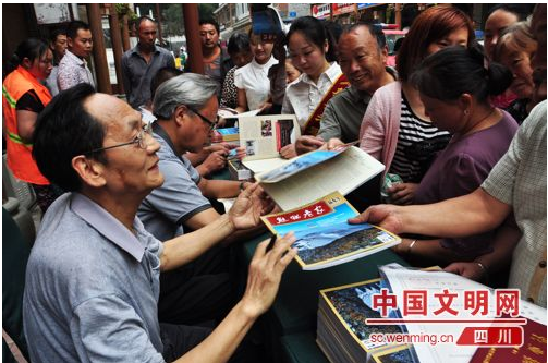 2015年7月20日上午10时,“感恩奋进《熊猫老家》杂志首发式”在宝兴县城十字街口成功举行(图片来源:中国文明网)