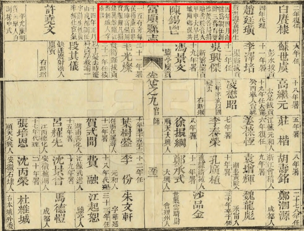 陈锡鬯,字洛君,江西新城(今江西黎川县)人,曾先后于光绪四年至十四年(1878—1888)、十五年(1889—1894)、二十八年(1902—1903)至二十九年三次担任富顺知县,总任长达十余年之久。民国二十年(1931)《富顺县志》(以下简称“宋志”)中多处留下了其治绩的记载。