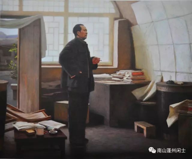 创作背景:抗战胜利后,蒋介石一意孤行,悍然发动全面内战。1947年3月,国民党军以25万人的兵力向陕北解放区发动重点进攻,企图达到攻占延安、摧毁共产党的党、政、军指挥中心,动摇军心,瓦解意志,削弱国际地位的目的。当时,在陕北的人民解放军仅1.6万余人,双方兵力极为悬殊。但毛泽东高瞻远瞩,决定亲自率领中共中央和人民解放军总部机关主动撤离延安,在极其艰险的环境中转战陕北达371天,行程1000余公里,并继续指挥全国解放战争,从而极大地鼓舞了全国各解放区军民的战斗意志和胜利信心。油画《转战陕北》,反映了毛泽东在极端艰苦和十分险恶的环境下依然乐观自信,对革命胜利充满信心。