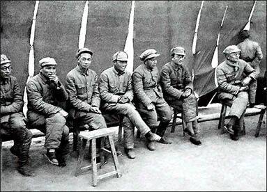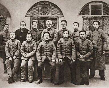 1937年12月,中共中央在延安召开政治局会议,与会者合影。左起,前排:项英、凯丰、王明、陈云、刘少奇;后排:彭德怀、张闻天、张国焘、林伯渠、博古、周恩来、毛泽东。