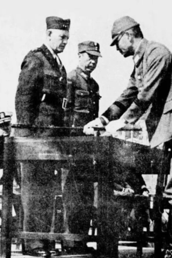 1945年10月,陈宝仓(中)在青岛接受日军投降。