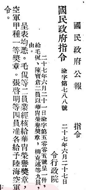 国民政府授予陈宝仓“华胄荣誉奖章”的指令