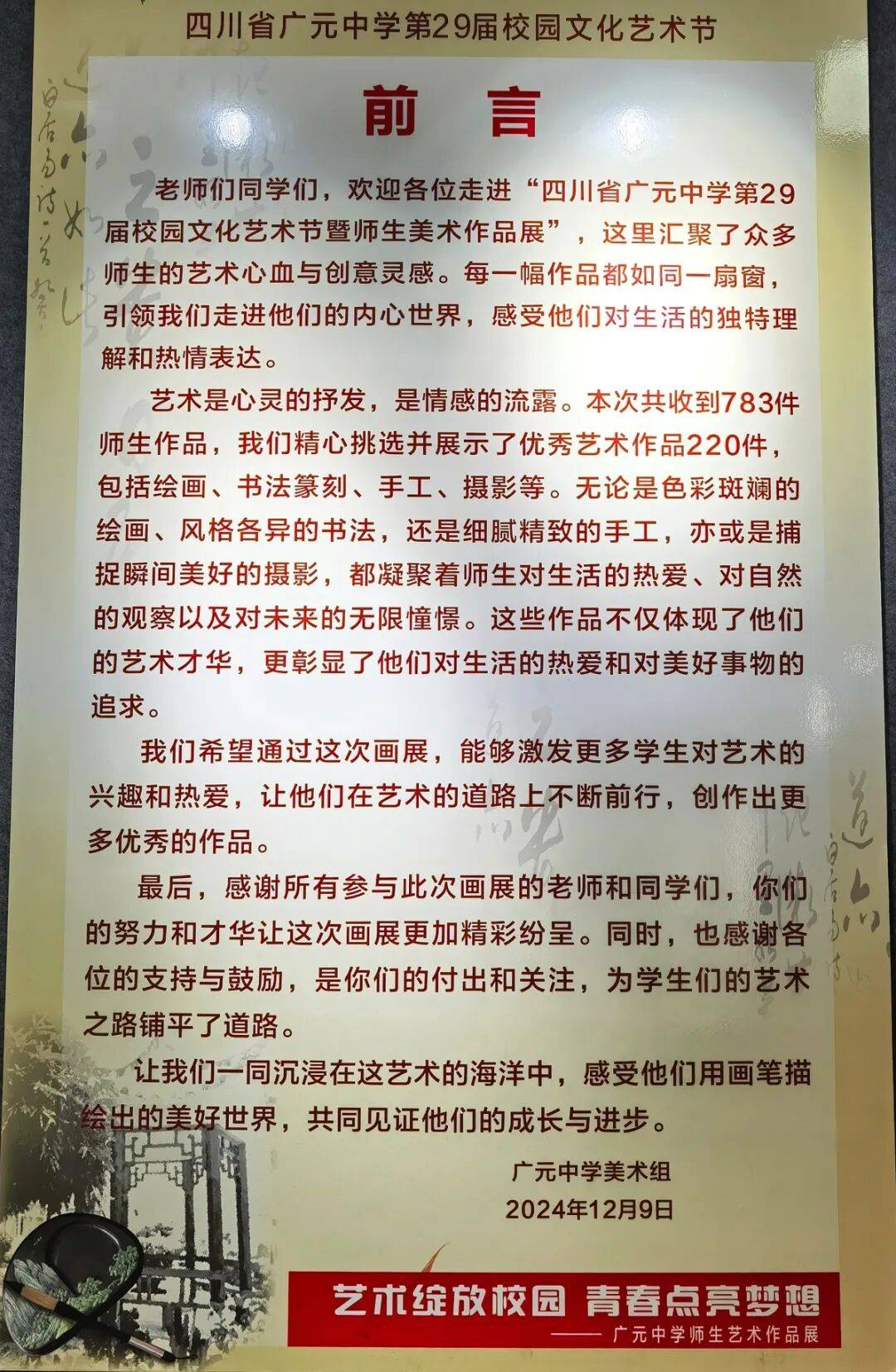 广元中学就是闪烁在这座古城之巅的明星,她发轫于公元1703年(清康熙四十二年),置“嘉陵书院”;1890年,修葺嘉陵书院,增其旧址,名曰“汉寿书院”;1929年,更名为广元县初级中学校,现代广元中学诞生;1943年,改名为广元县立中学;1949年12月,三校合并,统称广元县立中学;1953年,更名为四川省广元中学;1994年,成为省重点高中;2005年,创建成国家级示范高中;2013年,转评为四川省一级示范高中,2023年转评为四川省一级示范性普通高中(引领型)。三百年风雨兼程,三百年启智润心,学校以“博学广才、器识为先”为校训,秉承“立德树人”的使命奋力前行;如今,学校总面积达172亩,教职工451人,学生6600余人。