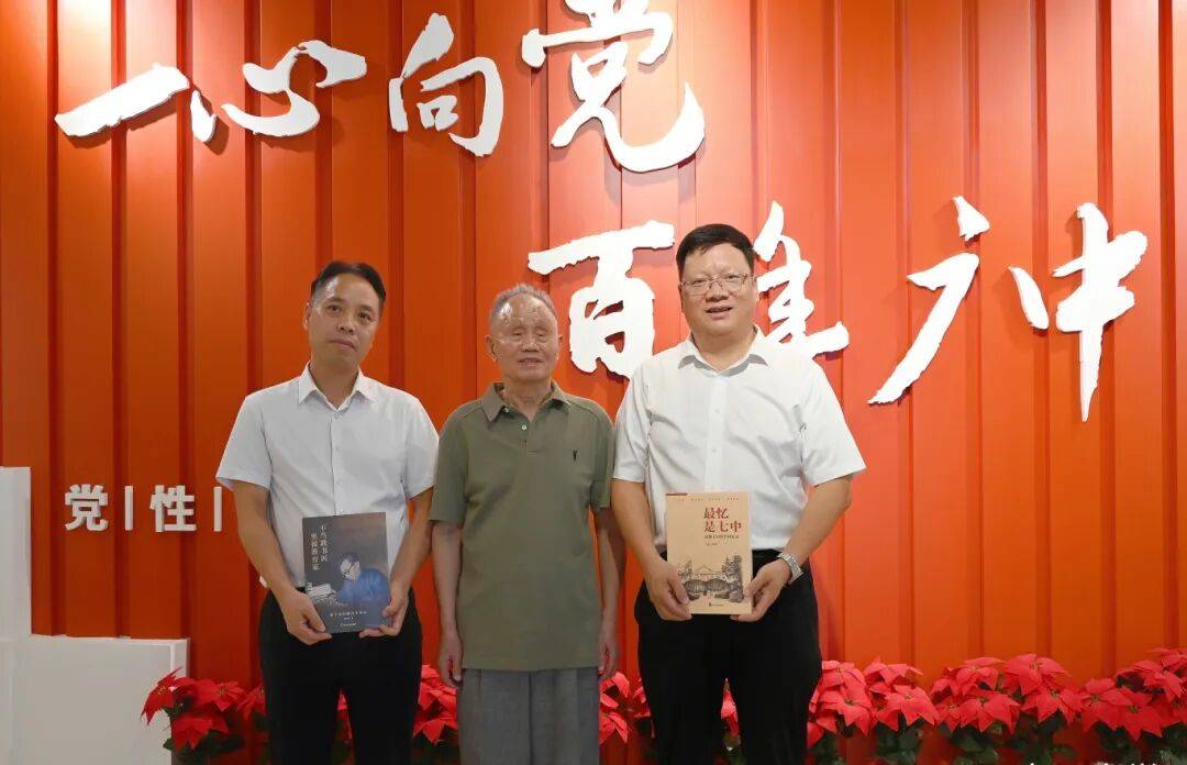 学校党委书记苏国刚(右一)、校长赵崇杰(左一)和老校长邓义初留影