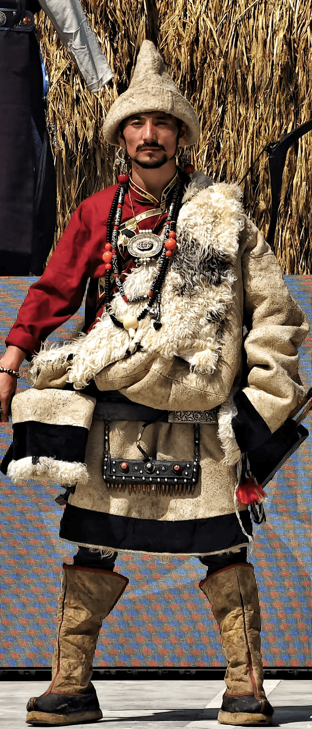 头戴毡帽、礼帽,冬季多戴狐皮帽;脚穿牛皮、布毡高筒皮底靴,筒高至膝。