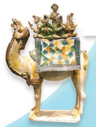 陕西历史博物馆藏三彩载乐骆驼俑,见证了文化艺术交融的历史。一块色彩斑斓的毛毯置于驼背之上,7名乐手手持不同乐器盘腿演奏,中间一女子正动情歌唱。一个“驼背上的乐队”,再现了鲜活的盛唐长安,各地人们在此相遇,尽情演绎对美好生活的追求。