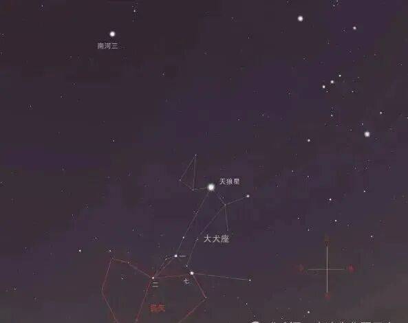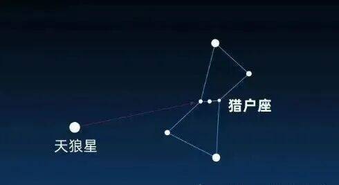 弧矢星、天狼星与参宿的位置示意图,右上方为参宿