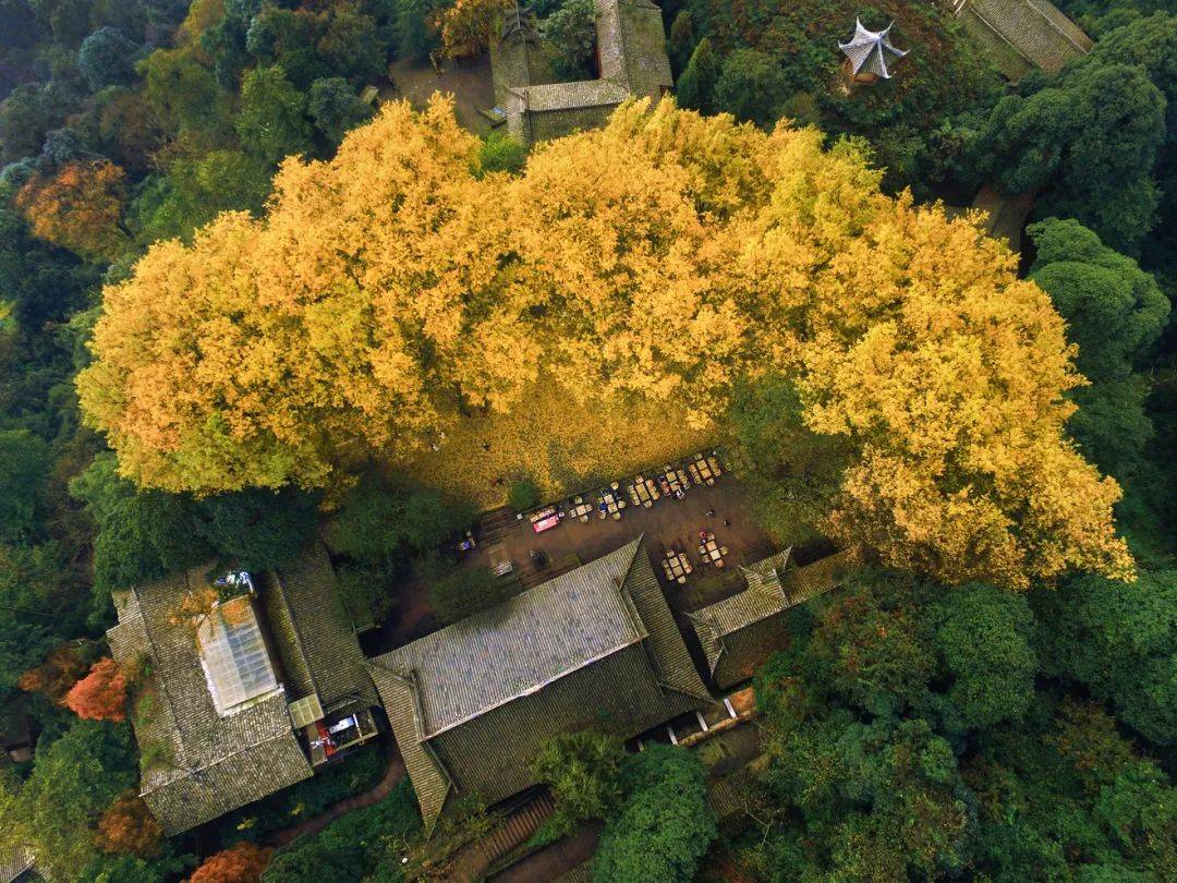 景区工作人员说,每年的深秋季是银杏最美的季节。那时,千年古银杏树的树叶变黄,随风飘落,宛如金色的地毯铺满了整座古寺,入眼便是大片大片夺目的金黄,仿佛置身于童话仙境。