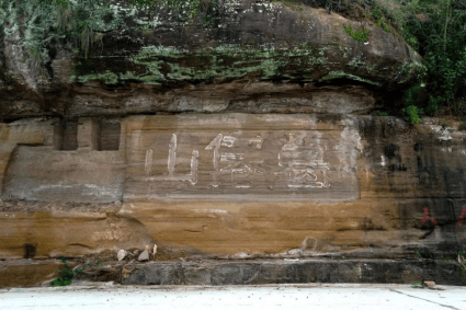 我起身把厚重的羽绒服脱下,江风袭来,湿透的衣服粘在身上,有了一丝凉意。怕感冒,所以不敢再停歇,继续慢慢往上爬去,来到北岭岩壁下。只见石壁上赫然出现“葛仙山”三字摩崖石刻,长4.4米,高1.3米,字径三尺许,深三寸,清晰可见,有秦篆汉隶之风。遗憾的是没有落款,看不出是什么时候,谁人所题,只知《富顺县志》有“颇似宋人书法或云唐刻”的表述。王果也语焉不详地认为是唐人留下的,耐人寻味。