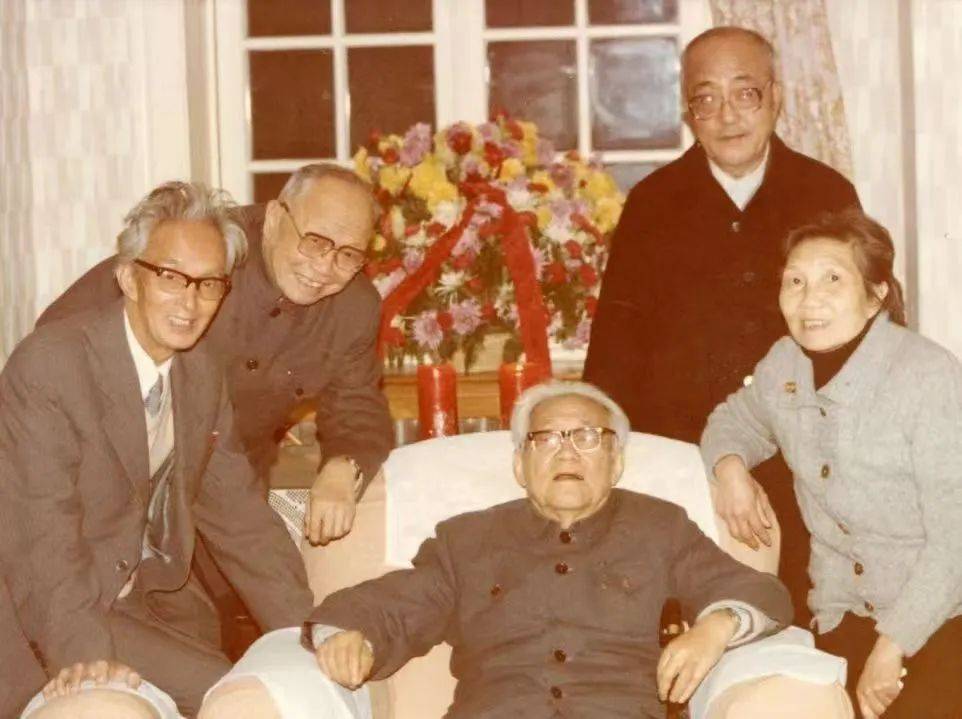 左起:赵瑞蕻、辛笛、巴金、黄裳、杨苡,摄于武康路 (来源:巴金故居)