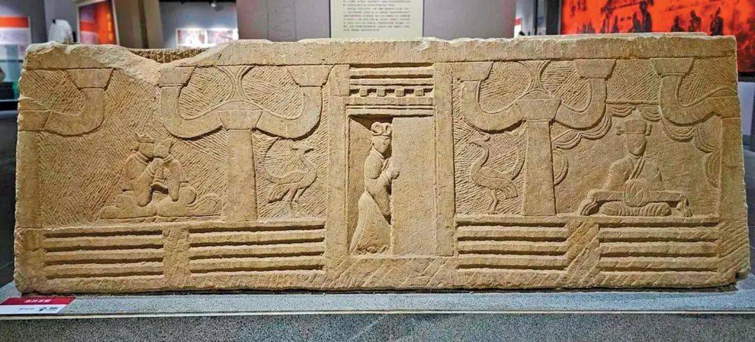 在石棺前,雕刻的庑殿式双层楼阁式阙巍然矗立,象征通往仙界的“天门”;棺后朱雀单足而立,振翅欲飞,暗含墓主升仙的期许。