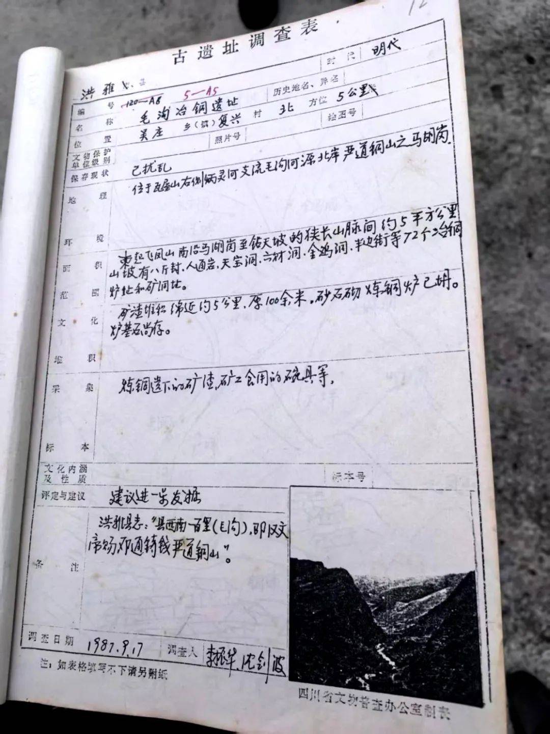 洪雅县毛沟冶铜遗址调查表(1987年9月17日)