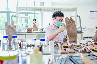 大足石刻文物医院,工作人员在对石质文物进行修复。黄舒摄/光明图片