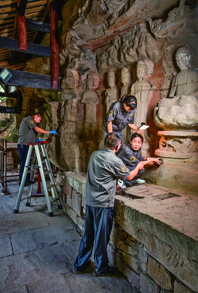 大足石刻研究院保护工程中心的文物修复人员正在进行文物修复。刘力摄/光明图片