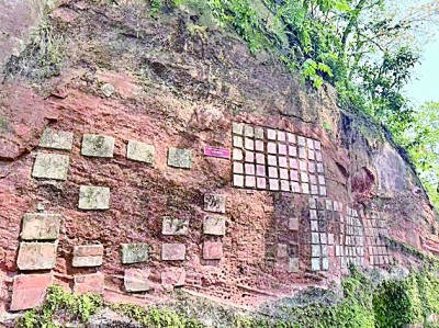 在千年后的今天,调研组从乐山大佛身后东南方的崖壁上,看到百余块颜色不一的面层修缮材料试验样本。各种修复材料以不同配比制成小方块,与大佛“共经风雨”,科研人员最后从中挑选出最契合的颜色,以达到无痕修复的效果。
